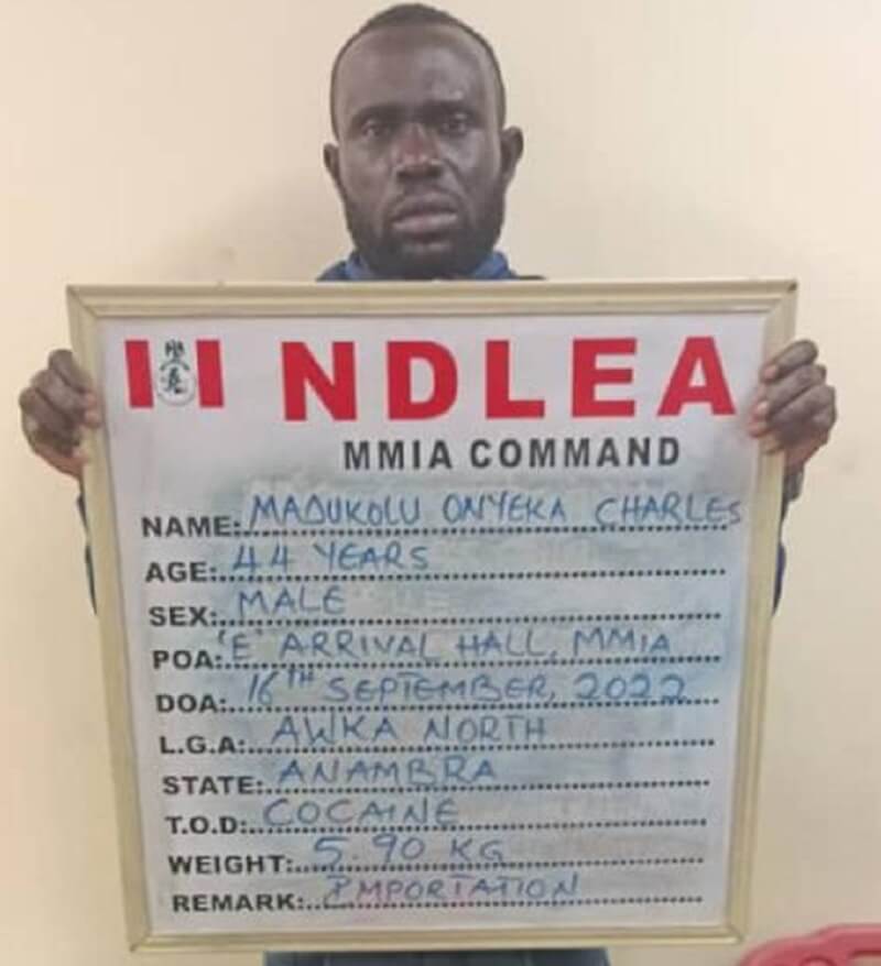 Operatives of the National Drug Law Enforcement Agency (NDLEA), have arrested an ex-convict, Onyeka Charles Madukolu, at the Murtala Muhammed International Airport, Ikeja Lagos, for importing 5.90 kilograms of cocaine concealed in cans of deodorants and ladies’ lip gloss into Nigeria.