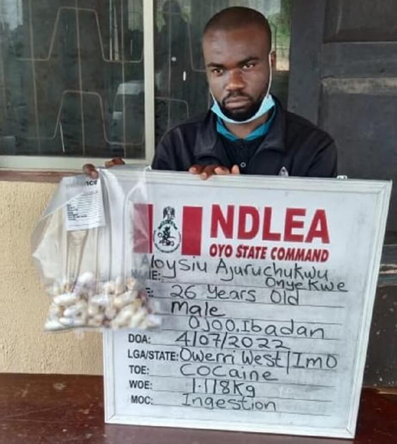 In a related development, the desperate bid by a drug trafficker, Aloysius Ajuruchukwu Onyekwe (a.k.a Kelvin), to travel by road to Algeria through Sokoto state with ingested 47 wraps of cocaine in his stomach, has been frustrated by NDLEA operatives who intercepted him in Ibadan, Oyo state, following intelligence shared by the Department of State Security (DSS).