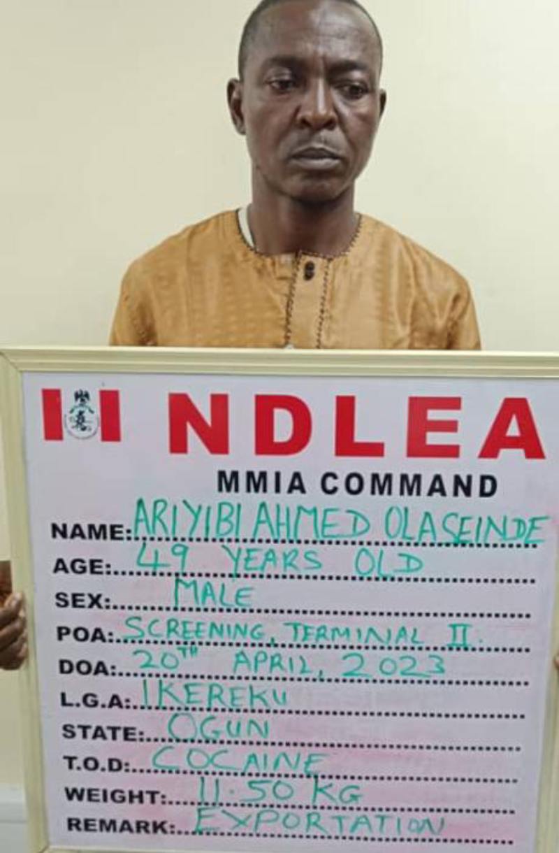 Ariyibi was intercepted on Thursday 20th April at the screening point of MMIA Terminal 2 during outward clearance of Qatar Airways passengers travelling from Lagos via Doha to Medina, Saudi Arabia. When his carry-on bag was checked, four sets of white lace material with linings of substance that tested positive to Cocaine weighing 11.50kg were discovered.
