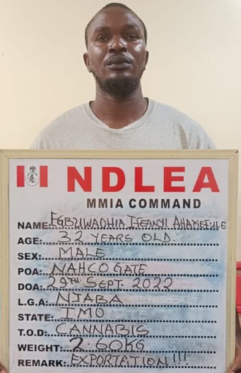 Weeks after NDLEA operatives intercepted 5.20kgs of cannabis concealed in kegs of palm oil going to Dubai at the NAHCO export shed of the airport, the brain behind the consignment, Ifeanyi Egbuwaohia, has been arrested in Igando area of Lagos. Though Ifeanyi works as a technician at Computer Village, Ikeja but beneath his known business he also works with a drug network in Dubai, where he sends illicit drugs for distribution. Few hours after his arrest, another consignment of 2.60kgs of the same substance sent by him for export to Dubai was also intercepted by operatives at the airport.