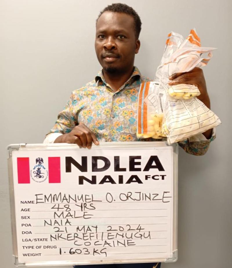 Okechukwu who also claims he is a professional footballer in Europe was arrested on Tuesday 21st May during the outward clearance of Airfrance flight AF 878 from Abuja to Paris, France. After a body scan confirmed he ingested illicit drugs, he was taken into custody where he excreted a total of 111 pellets of cocaine that weighed 1.603 kilograms over a period of three days. The suspect claimed he does business in the maritime sector while still scouting for any European football club to engage him.