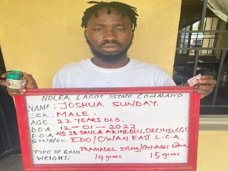 Operatives of the National Drug Law Enforcement Agency (NDLEA), in the early hours of Wednesday, January 12, 2022, arrested a skit maker, Sunday Joshua, popularly known on social media as 'De-General', following the raid of a notorious drug joint at Orchid Estate, Lekki area of Lagos state.