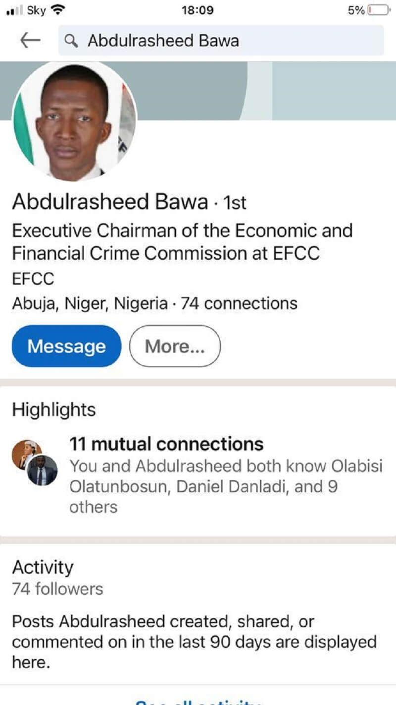 The Economic and Financial Crime Commission (EFCC) has notified members of the public of the existence of a fake LinkedIn account, supposedly belonging to the Executive Chairman of the Commission, Abdulraheed Bawa.