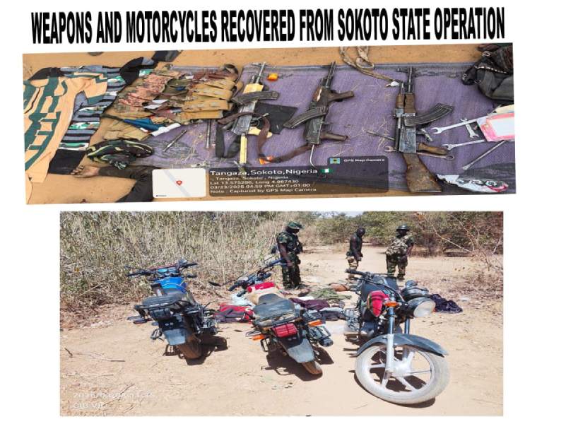 "In Sokoto State, on 25 March 2026, troops of COAS Intervention Battalion VII made 2 seperate contacts with terrorists at Magonho Forest where they eliminated 3 bandits and recovered 3 AK 47 rifles and motorcycles.