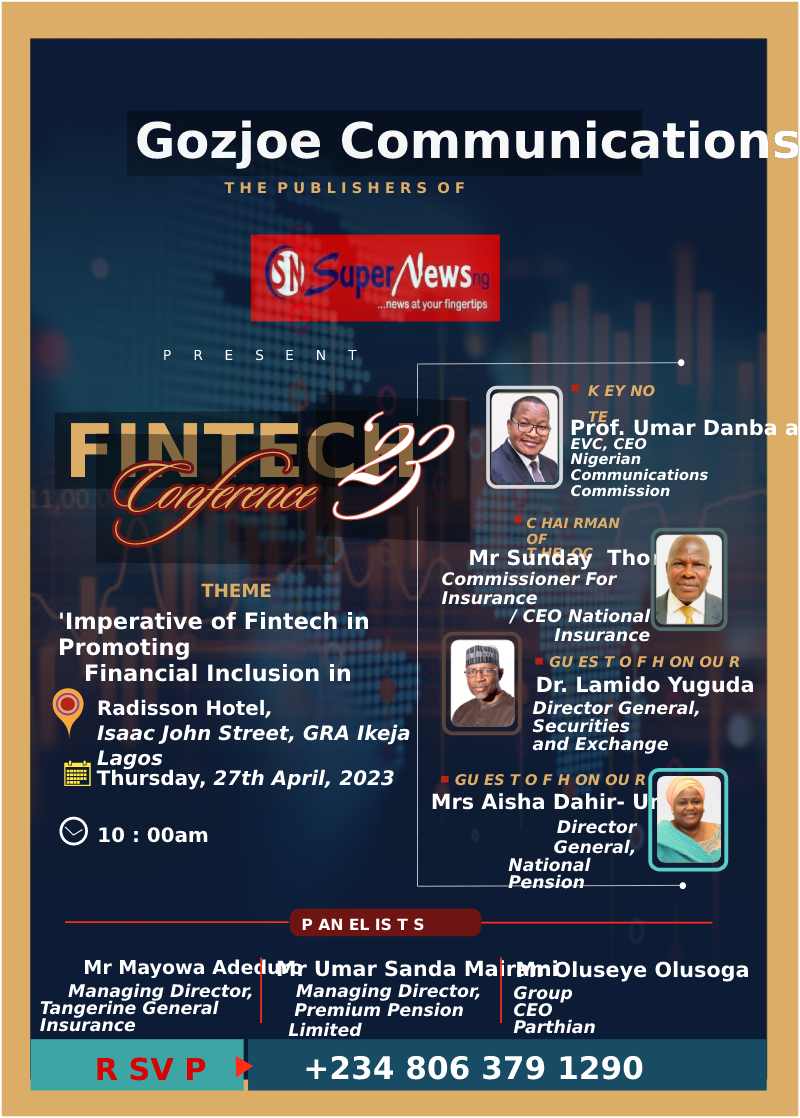 SUPERNEWS Nigeria, will, on Thursday, April 27, 2023, bring together regulators and experts from the financial services sector in Lagos, to examine the relevance of Fintech in bringing the unbanked, uninsured and those yet to be part of pension into the financial system for economic growth.