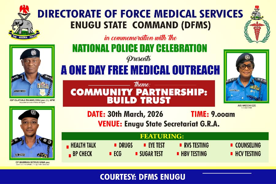 As part of activities lined up for the week-long celebration of National Police Day 2026, the Enugu State Command’s Police Medical Directorate will conduct a one-day free medical outreach on Monday, March 30, 2026, at the State Headquarters, Enugu State GRA, Enugu, by 9:00 a.m.